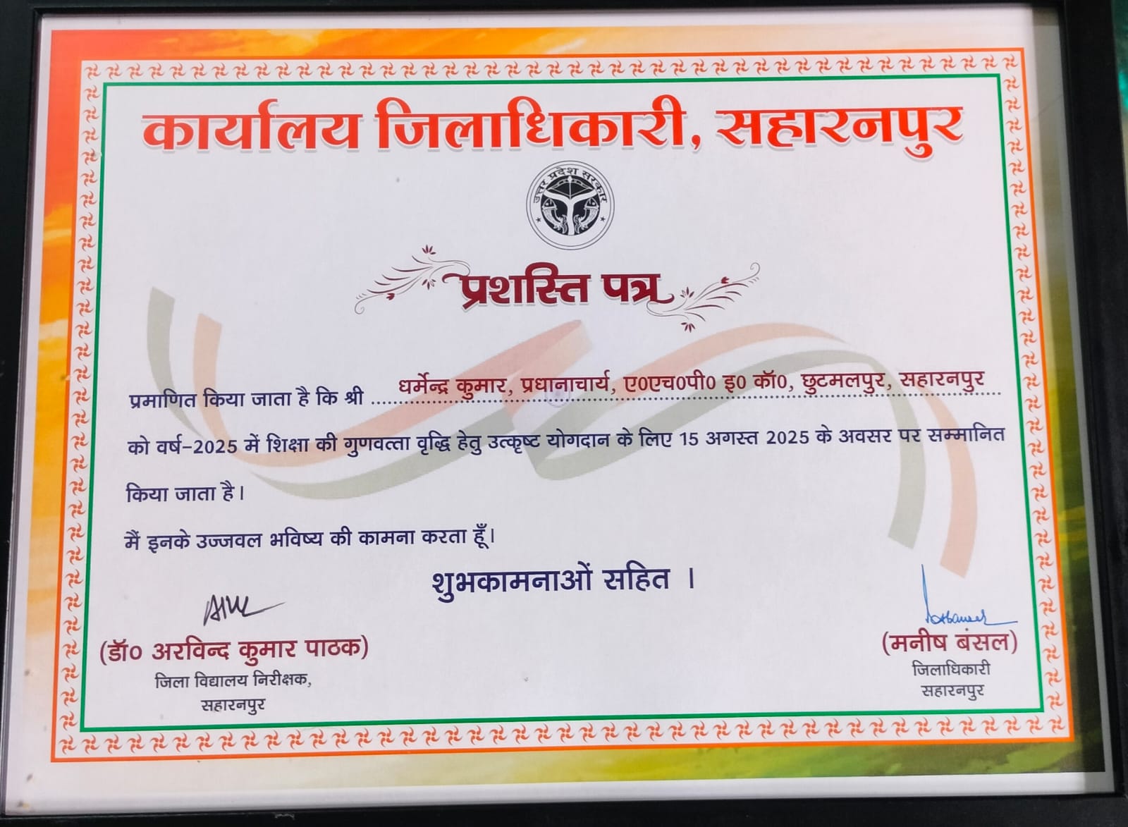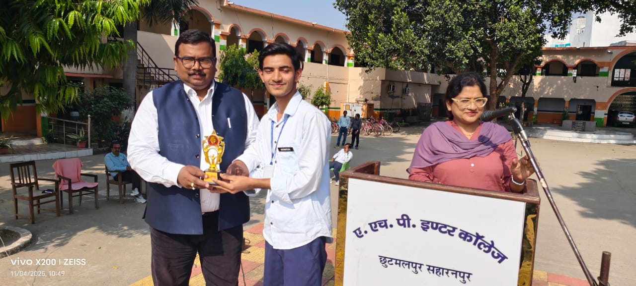 मेघावियों का सम्मान , मुख्य अतिथि प्रधानाचार्य ए.एच.पी. इन्टर कॉलेज, छुटमलपुर : 18 जून 2025